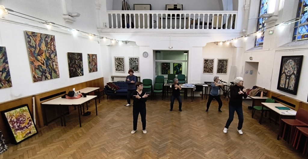 dix huit participant·es avec, sur la photo ci-contre, Véronique à la manœuvre pour un échauffement toujours nécessaire, fondamental et préparatoire à un travail sur le Serpent.