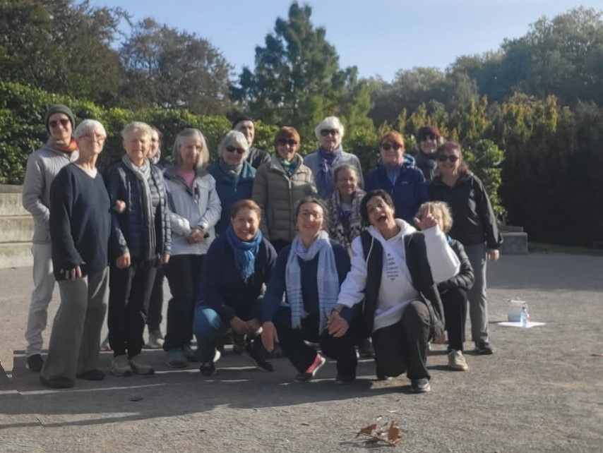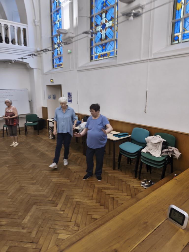 dix huit participant·es avec, sur la photo ci-contre, Véronique à la manœuvre pour un échauffement toujours nécessaire, fondamental et préparatoire à un travail sur le Serpent.